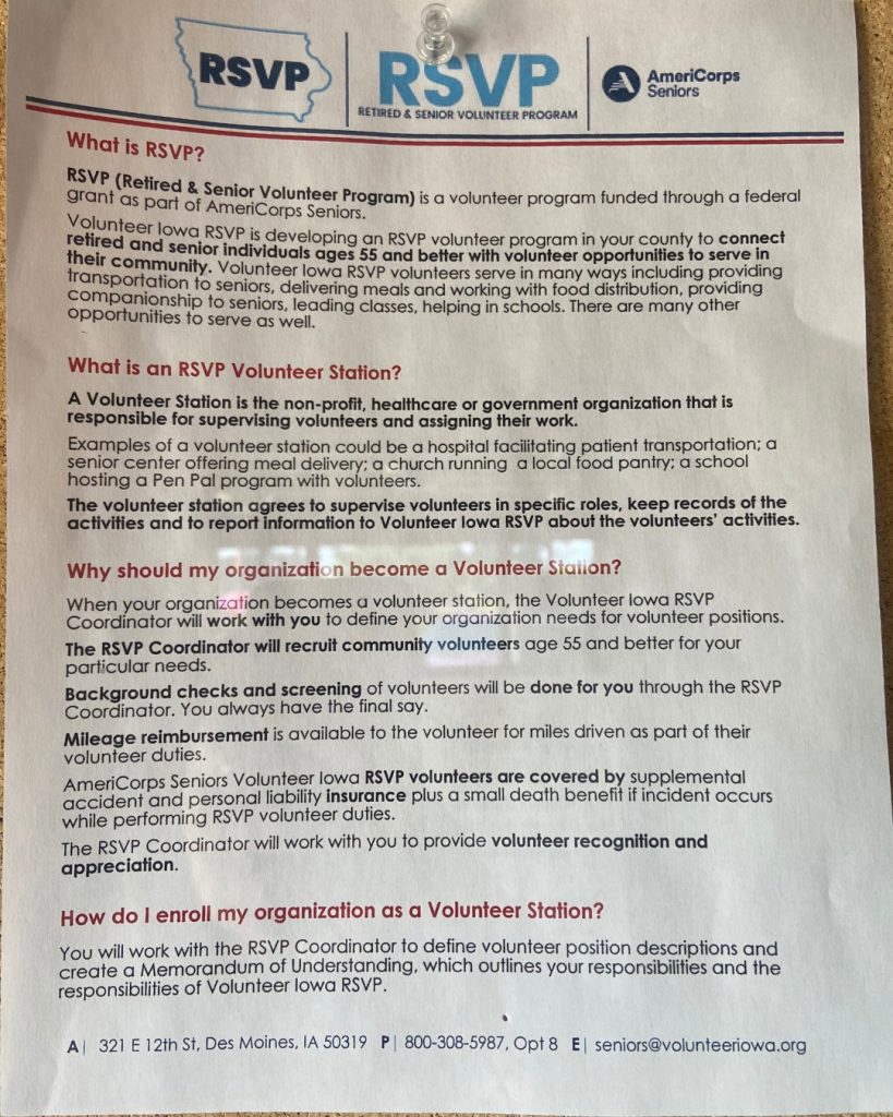 “Match is very important,” shares Sorensen. “There are so many cool volunteers with different skills and interests, so we want to fit them in organizations that match those skills.” She currently has one volunteer in Montezuma who delivers books to homebound individuals, and in the upcoming school year, she will have a volunteer who writes pen pal letters to elementary school students. Sorensen also noted that folks can volunteer to drive people to their doctor’s appointments or grocery store shopping — volunteer opportunities with RSVP can range from providing social connection to other people, improving access to food, or providing youth support. Sorensen works with each organization and identifies ways each location would utilize their volunteers — this way, she has the best opportunity to create a perfect volunteer match. She already has relationships with organizations like LINK Grinnell and the Mayflower.